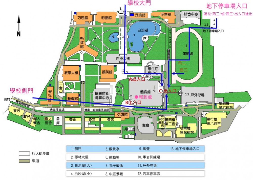 請從體育館C出入口進入報到處